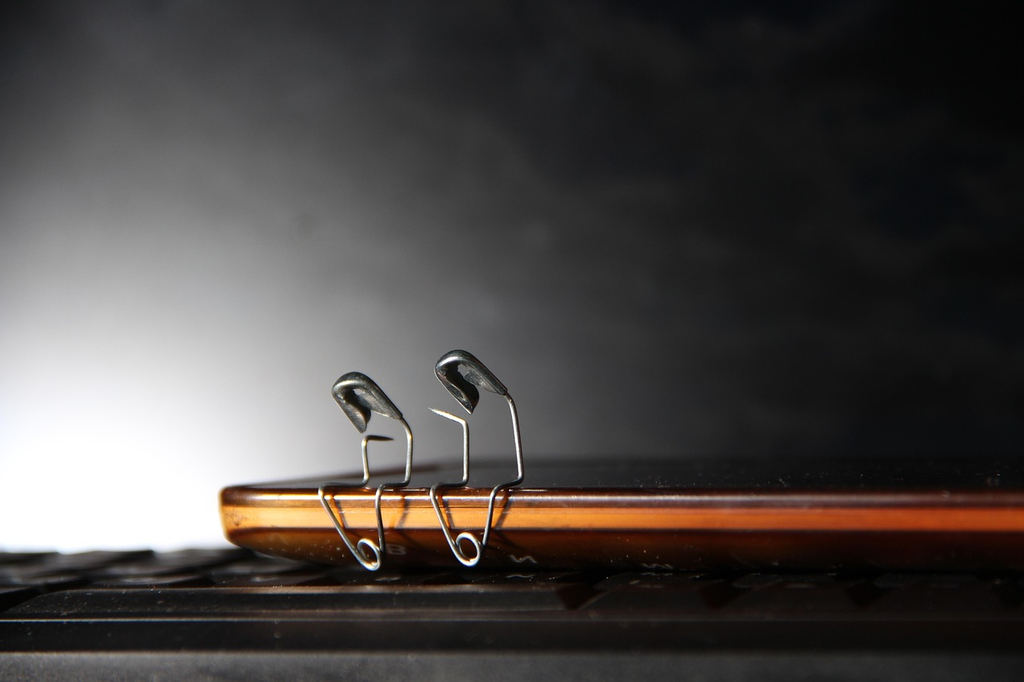 A sharp pin is bent into a clasping hook; the pointed end is secured in a spring-loaded clasp to fasten fabric safely.