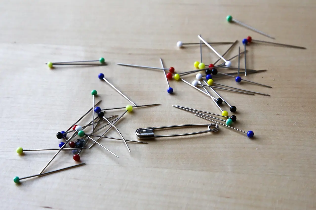 Push the pin through the fabric with the clasp closed so the point is hidden, using the right pin size to avoid tearing.