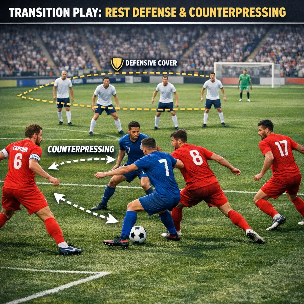Transition play is the phase when a team shifts from defense to attack or vice versa after a turnover or change of possession, including rest defense and counterpressing.