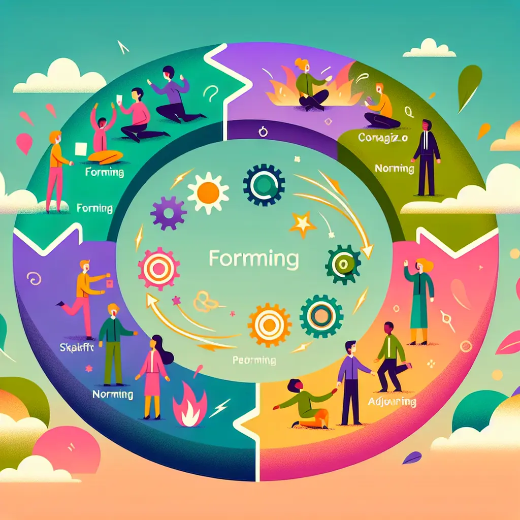 Forming: polite, cautious, goal setup. Storming: conflicts and role questions. Norming: growing cohesion and shared norms. Performing: high collaboration and productivity. Adjourning: project wrap-up and reflection.