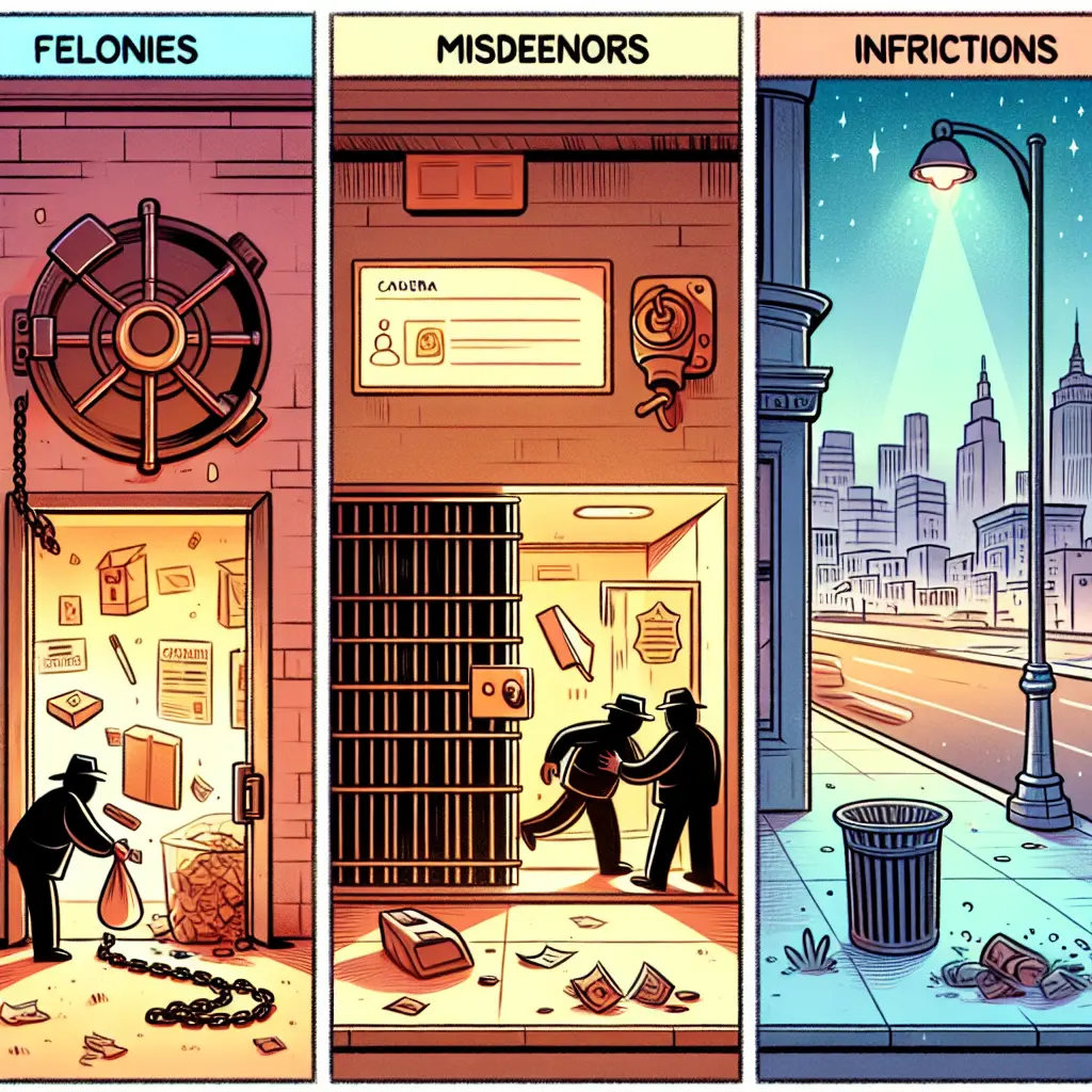 Felonies carry the longest terms and most serious consequences, misdemeanors carry shorter jail terms and smaller fines, and infractions typically result in fines with no jail time.
