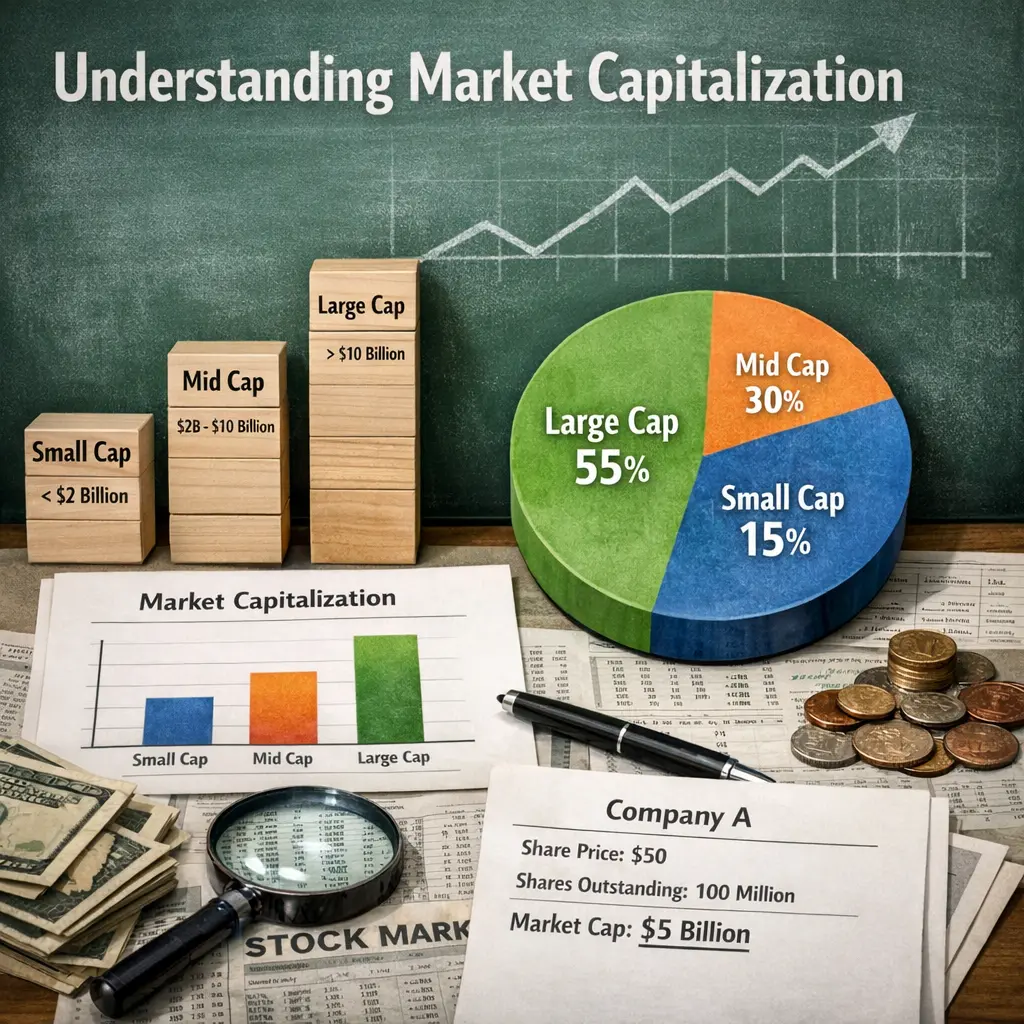 Market capitalization, often called "market cap," is the total value of a company’s outstanding shares of stock in the US stock markets. It is calculated by multiplying the current share price by the total number of outstanding shares. Market cap helps investors gauge a company’s size, risk, and investment potential, categorizing companies as large-cap, mid-cap, or small-cap, each with distinct characteristics and risk profiles in the market.