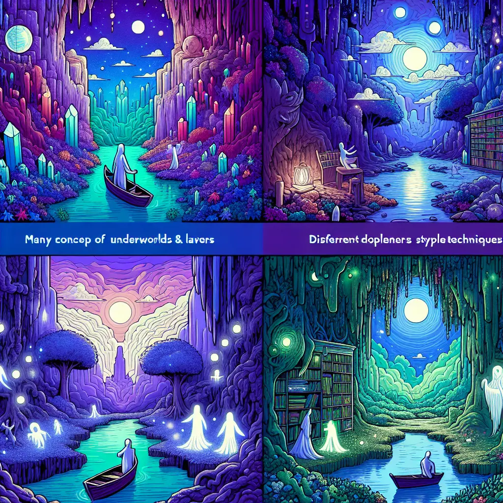 "Underworlds & Afterlives" refers to the mythological, religious, and cultural concepts of realms or dimensions where souls go after death. Underworlds are often depicted as hidden or subterranean places, sometimes associated with judgment, punishment, or transformation. Afterlives encompass a broader range of beliefs about existence beyond physical death, including heavens, hells, reincarnation, or spiritual continuance, reflecting humanity's enduring curiosity and hope regarding what happens when life ends.