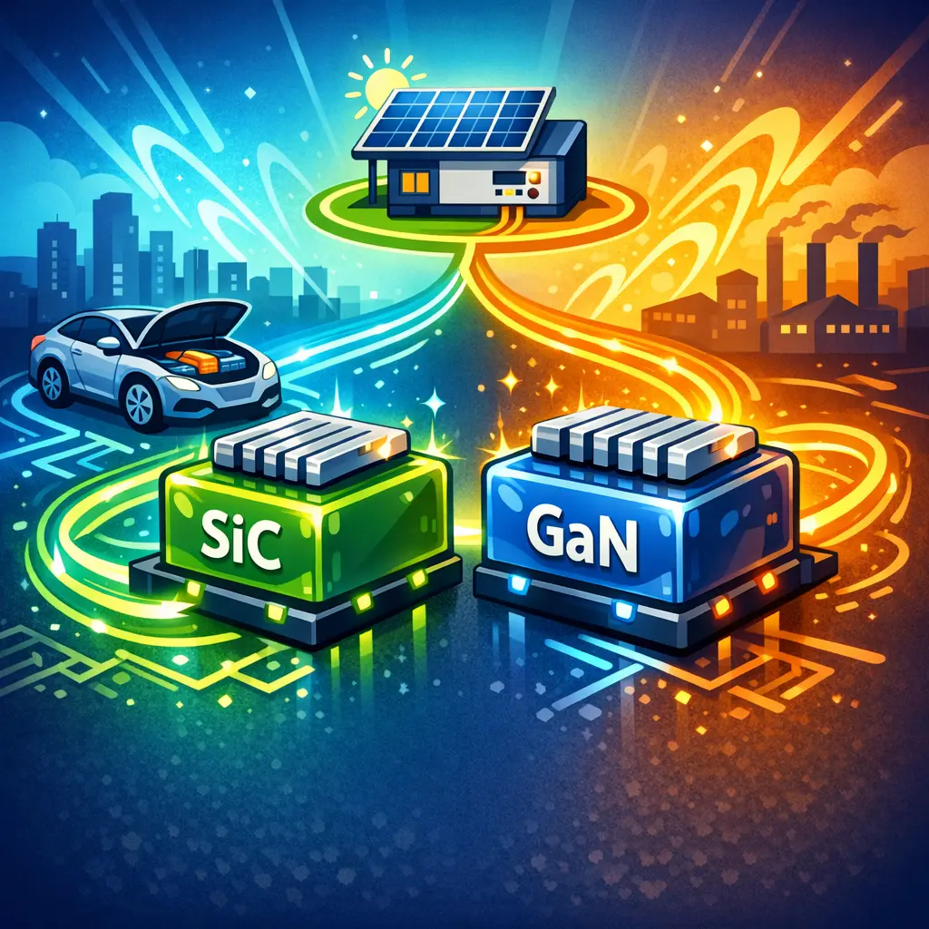 SiC is commonly used for high-voltage MOSFETs and diodes with excellent high-temperature performance; GaN is used for high-speed transistors (HEMTs) that enable very fast switching and high-frequency operation.
